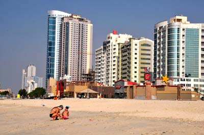 I wznoszonych nowych, chociaż miejsca na kolejne bezpośrednio nad zatoką pozostało już niewiele. Wystarczy cały czas iść wzdłuż plaży. Dojście niemal do granicy z emiratem Szardża i z powrotem zajęło nam, z fotografowaniem, około dwu godzin.
