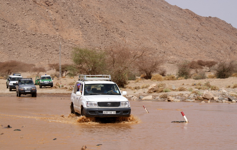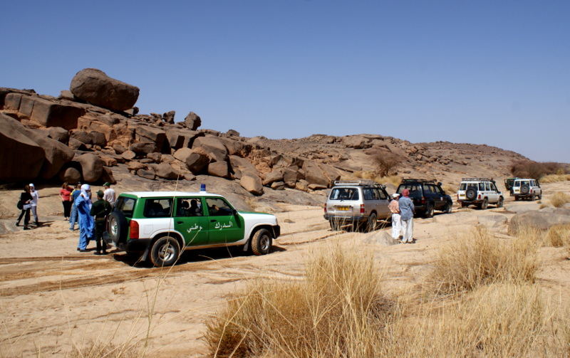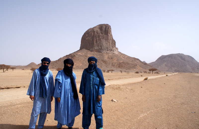 Następnego ranka wyruszamy na pustynię z Tuaregami, którzy odbierali nas z lotniska. Podjechał punktualnie pod hotel samochodami z napędem na cztery koła. Dyrektorem Generalnym regionalnego oddziału ONAT, który gościł nas w Algierii jest w Tamanrasset Kamal Lassou. Tuaregowie ubrani w tradycyjne garnitury (spodnie i „sukienka”), nazywane tu gandura, każdy z nich na głowie ma kolorowy zawój, szesz. Jego typowe kolory, to niebieski, biały i indygo, ew. czarny. Nasz przewodnik i kierowca Bey Ben Malek, który jest poza tym dyplomowanym geologiem ma 193 cm wzrostu i twierdzi, że potrzebuje na swój szesz min. 5 metrów materiału. Dla niższych wystarczą 3 metry.