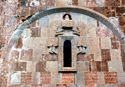 Natomiast podłoga pokryta jest płytami grobowymi, gdyż kaplica ta przez wieki była nekropolią książęcego domu Górnego Chaczenu. Do świątyni tej od południa przylega Mała Bazylika, jak gdyby wciśnięta między nią i narteks z arkadami mniejszej świątyni, nazywanej katedralną, Arzu Chatun, zbudowanej w 1214 roku.