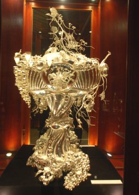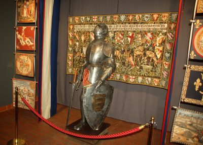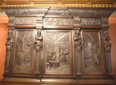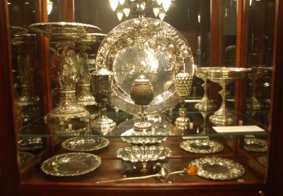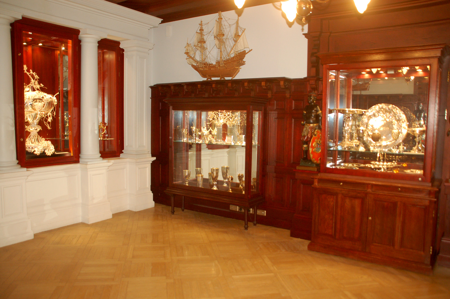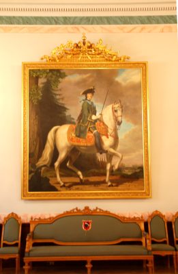 Ponadto starych mebli z lichtarzami i naczyń stołowych, fragmentów ocalałych kamiennych dekoracji gmachu. Następnie na parterze i piętrach. Robię prawie 60 zdjęć wnętrz oraz wielu detali w nich: starych mebli, obrazów, rzeźb, kaflowych pieców oraz różnych przedmiotów, m.in. pięknie zdobionych pucharów, złoconych starych naczyń itp. wystawionych w gablotach. Na placu przed Domem Czarnogłowych stoi posąg z 1897 r., przedstawiający Rolanda – bohatera średniowiecznego eposu rycerskiego. Pomnik ten również odrestaurowano w 1999 r.