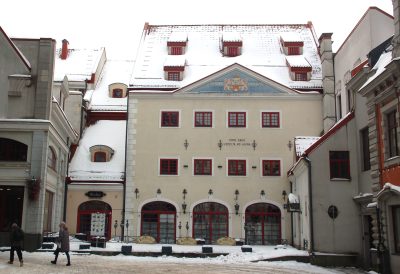Była to pierwotnie organizacja typu paramilitarnego, nastawiona na ochronę, a nawet czynną obronę handlowych interesów jej członków. Na przełomie XVI i XVII w. dom został przebudowany uzyskując ceglaną, bogato zdobioną, manierystyczną fasadę na wzór niderlandzko-flamandzkich domów cechowych. Przez długie lata jego wnętrza były najbardziej paradnymi pomieszczeniami w mieście. Bywali w nich carowie rosyjscy, królowie Szwecji, liczni książęta. Od września 1920 r. odbywały się w nim posiedzenia plenarne rokowań pokojowych wojny polsko-bolszewickiej z lat 1919–1920.