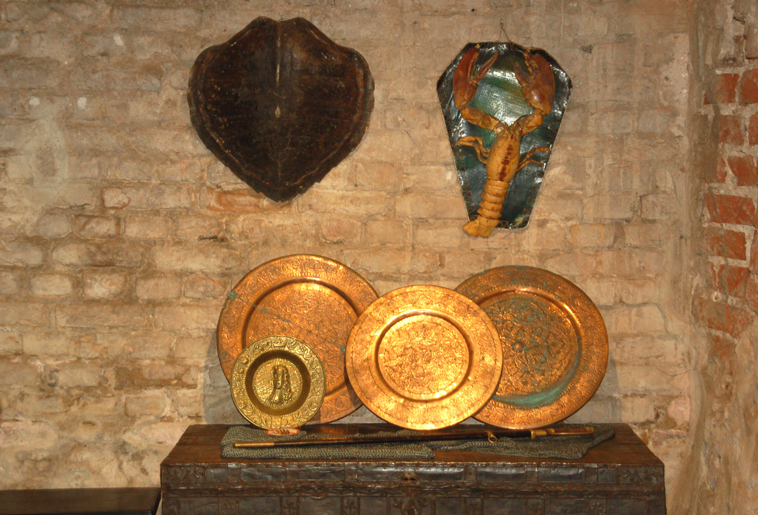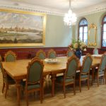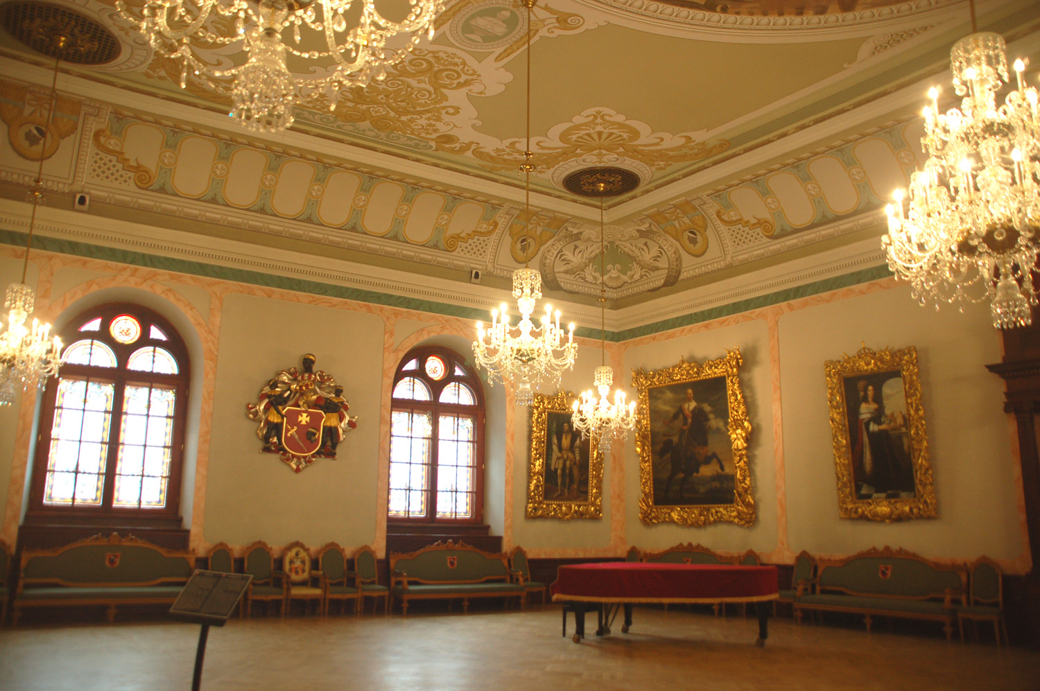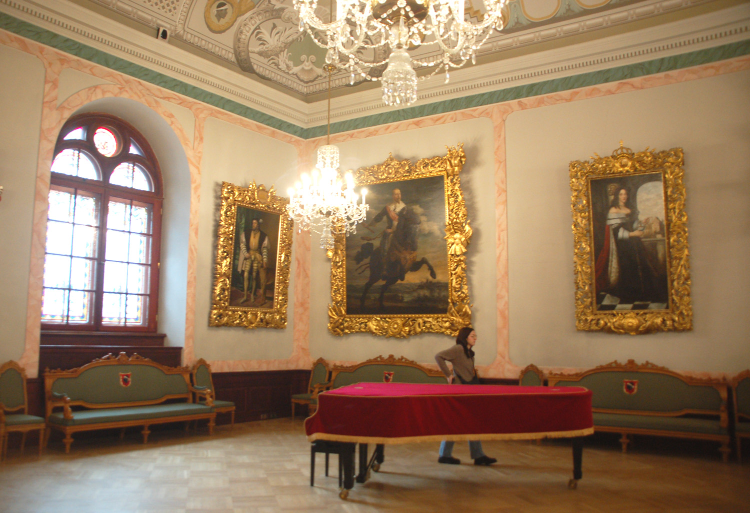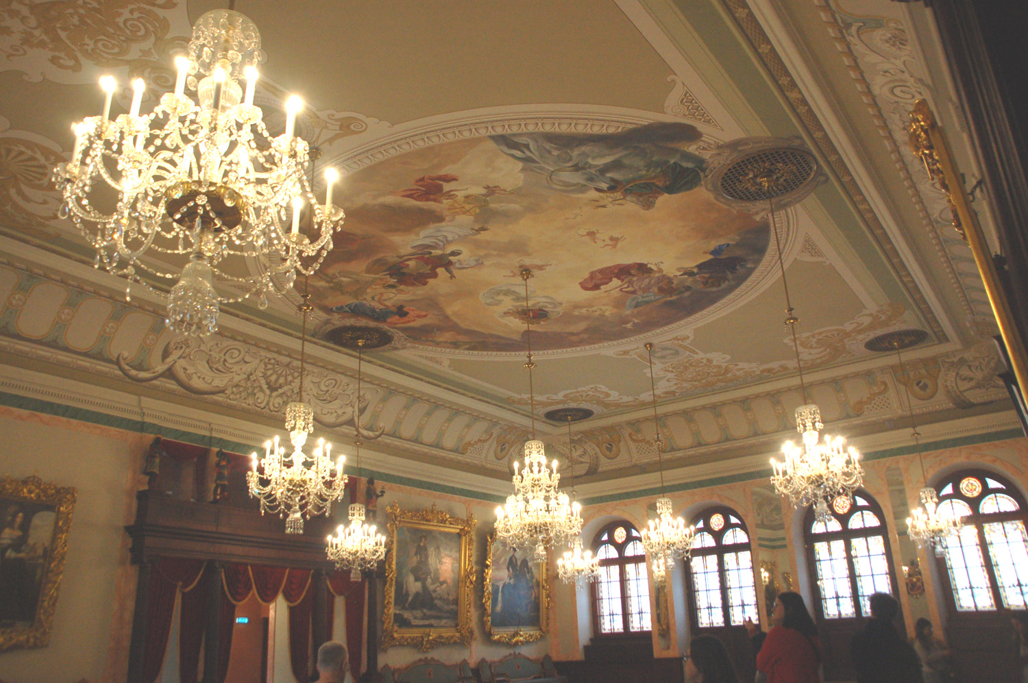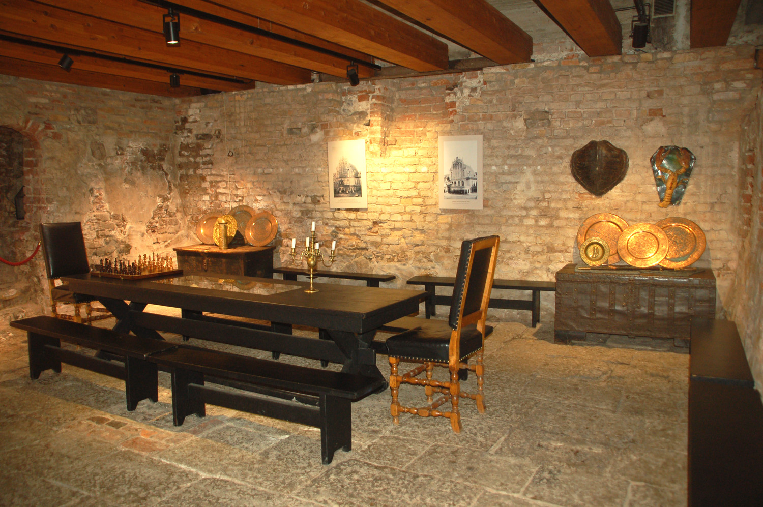 Na schodach prowadzących do wielkiej sali znajdują się popiersia wybitnych kompozytorów: Johanna S. Bacha, Georga F. Händla, Josepha Haydna, Wolfganga Amadeusza Mozarta, Ludwiga van Beethovena, Franza Schuberta, Richarda Wagnera i Johannesa Brahmsa. Po raz pierwszy mam możliwość zwiedzenia wnętrz Domu Czarnogłowych. Od częściowo zachowanych piwnic, w których znajduje się m.in. ekspozycja średniowiecznej broni, beczek na wino, pomieszczenia wag i dawnych towarów, a także rzeźb rycerza z mieczem, lwów i antycznej bogini.