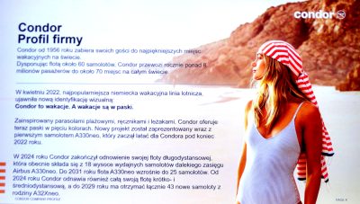 Condor, którego przedstawiciel przypomniał, że działa ona od roku 1956, aktualnie posiada 60 samolotów którymi zabiera rocznie ponad 8 milinów turystów do 70 najpiękniejszych miejsc na świecie. W 2022 roku ta najpopularniejsza w Niemczech wakacyjna linia lotnicza rozpoczęła program „wakacje w paski”. W dwa lata później odnowiła swoją długodystansową flotę powietrzną, aktualnie odnawia krótko i średniodystansową, a do roku 2029 ma otrzymać 43 nowe samoloty z rodziny A32Xneo. Przedstawił też nowości w lotach do krajów odległych na zimę 2025/2026 i na przyszłe lato.