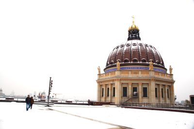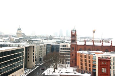 Mamy trochę pecha, bo poprzedniego dnia była słoneczna pogoda, chociaż z silnym wiatrem i temperaturą niewiele ponad zero. Dziś Berlin pokrył świeży śnieg, a ponadto pojawiła się, na szczęście niezbyt gęsta mgła. Widać jednak pobliskie, charakterystyczne budowle, nawet trochę dalsze dzielnice, ale zdjęcia wychodzą marne. Andrea opowiada nam o Forum i historii tego miejsca, którą później pogłębiam korzystając z mnóstwa bezpłatnych publikacji w językach: niemieckim i angielskim, jakie znajduję w tutejszej placówce Informacji Turystycznej