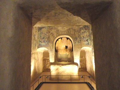 Kolejna stacja to częściowa rekonstrukcja jaskini. Opuść pomieszczenie ponownie przez te same drzwi. Trzymaj się lewej strony. Przejdź do następnego obszaru wystawy „Północny Jedwabny Szlak” (pokój 317). Jaskinia 16 Nosicieli Mieczy znajduje się po prawej stronie pomieszczenia. Jest to częściowa rekonstrukcja jaskini Kizil 8. Zachodnio wyglądający wygląd tych figurek fundatorów zaskoczył członków niemieckich ekspedycji na początku XX w. Nazywano ich „miecznikami” i zastanawiano się nad ich podobieństwem do średniowiecznych rycerzy.
