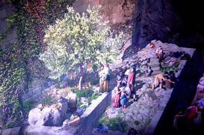 Podobnie inne części miasta z bazarem i codziennymi, pomimo święta, zajęciami mieszkańców. Oświetlenie Panoramy zmienia się co chwila. Zarówno całości, jak i jej poszczególnych części, jak gdyby o różnych porach dnia, jego świtu, zmierzchu i nocy. Jest to atrakcyjne podczas oglądania, ale bardzo trudne do, dozwolonego oczywiście bez fleszy, fotografowania. Robione nawet w różnych kombinacjach zdjęcia, z oczekiwaniem, kiedy wybrany fragment Panoramy będzie ponownie najlepiej oświetlony, daje jednak niezadowalające rezultaty, co widać na publikowanych w tej relacji. Schodząc po schodach w dół, można z niższych platform widokowych oglądać z bliska dokładniej jej fragmenty.