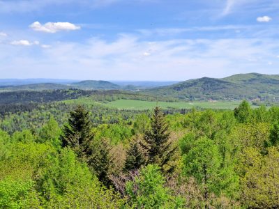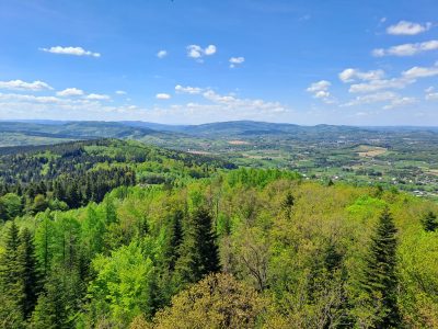 * z Męciny Wielkiej – za znakami wspomnianego już szlaku zielonego. Start przy cerkwi (jest parking). Ładna, widokowa wycieczka.