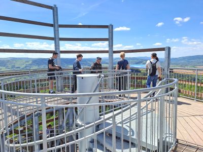 Kondygnację niżej znajduje się wlot zjeżdżalni. Rura długa na 54 m oplata wewnątrz konstrukcję wieży. Dla bezpieczeństwa korzystanie z niej reguluje sygnalizacja świetlna. Czerwone – czekać, zielone – można jechać. W ostatnią majówkę system nie podołał. Zjeżdżający się jednak zorganizowali: każdy kto kończył zjazd krzyczał do rury: „Wolne, można jechać”. Działało.