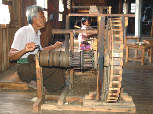 Sądzę, że światowe muzea włókiennictwa sporo zapłaciłyby za takie egzemplarze, byle tylko zdobyć je do swoich zbiorów. W jednym miejscu staruszka na drewnianych kołowrotkach z siłą napędową w postaci koła starego roweru, snuje nitki. W innym przędzarz kręci prawą ręką ogromnym drewnianym kołem, lewą regulując nawijanie się przędzy na szpule.