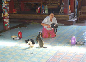 Kompleks kilkudziesięciu strzelistych, białych stup z charakterystycznymi zakończeniami, a także kilka stojących obok nich pagód, mijałem płynąc łodzią przez jezioro. W jego południowo zachodniej części na wodzie wznosi się inny klasztor: żeński Nga Phe Khaung. Bardziej znany jako Jumping Cat Monastery – Klasztor Skaczących Kotów.