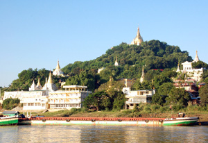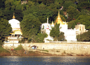 Nie na darmo Birma nazywana jest krajem 100.000 stup. Większe ich skupienie – trudno je oglądać, gdyż widać tylko sylwetki oświetlane z drugiej strony – to chyba Awa. Ale wkrótce uwagę przyciągają coraz liczniejsze, błyszczące w słońcu złote i białe stupy, pagody i klasztory na prawym brzegu rzeki.Wspinają się na zielone wzgórza, wychylają swoje wieże i kopuły spoza ich grzbietów oraz krawędzi. Mijamy Saigaing, jedno z głównych w Birmie centrów buddyzmu.
