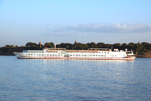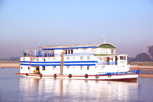 Luksusowy i odpowiednio drogi, zbudowany w Niemczech 4-pokładowy, długi biały parowiec, którym pływają niemal wyłącznie cudzoziemcy zwiedzając na trasie najcenniejsze zabytki oraz najciekawsze miejsca. Dominują jednak statki niewielkie, zabierające po kilkadziesiąt osób. Przeważnie bez kajut. Jednym z nich właśnie popłyniemy.Przystań rzeczna w Mandalaj z której wyruszamy, jest więcej niż prymitywna. Pora deszczowa minęła już dosyć dawno. I chociaż do szczytu suchej pozostało jeszcze trochę czasu, poziom wody nie jest zbyt wysoki. Do zacumowanego przy brzegu w drugiej linii stateczku schodzimy dosyć stromymi schodami na skarpie, a następnie przez jakiś stateczek wchodzimy po prymitywnych, drewnianych deskach udających trapy, na właściwy pokład.