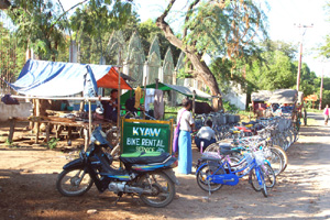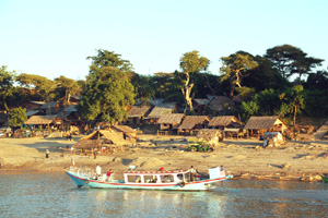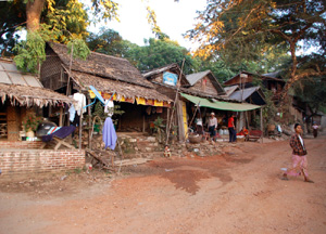 Na rzece jest coraz więcej łodzi i stateczków. Przy brzegu cumuje słynny, wspomniany już luksusowy statek pasażerski „Road to Mandalay”. To co widzę na brzegu jest trochę szokujące, chociaż do birmańskiej nędzy zdążyłem się już trochę przyzwyczaić. Kilkanaście, może kilkadziesiąt – wśród drzew i zieleni dokładnie nie widać – prymitywnych, w większości krytych chyba trzciną drewnianych chat.Trochę krzątających się ludzi, jakiś trójkołowiec czekający na potencjalnych pasażerów. Dobijamy do przystani. Jest równie, a może jeszcze bardziej prymitywna, niż w Mandalaj.