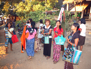 Na brzeg, znowu przez jakąś mniejszą łódź, schodzimy po wąskiej, chyboczącej się desce. Natychmiast otacza nas grono dziewcząt i kobiet oferujących bransolety z laki, jakieś szale i inne upominki.