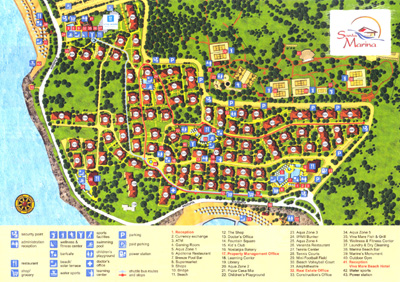 W folderze jaki otrzymałem przeczytałem, że w osadzie tej jest 5 basenów + 4 dla dzieci. 2 plaże i 2 dodatkowe z barami. 4 restauracje, piekarnia – cukiernia, 3 bary, centrum SPA i Wellnes. Plac zabaw dla dzieci i dziecięcy klub z animacją. 2 supermarkety, sklep z kosmetyką, art. sportowymi i gospodarstwa domowego. Ośrodek medyczny i apteka.