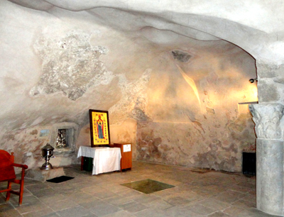 Między głównym budynkiem dawnego monastyru i więzienia oraz innymi budynkami klasztornymi stoi niewielka, kamienna, kryta czerwoną dachówką cerkiewka p.w. Zaśnięcia NMP (Uspienia Bożej Materi). Z maleńką, okrągłą wieżyczką nakrytą niemal płaskim dachem. Zbudowano ją w XV-XVI w, ale zapewne z uwzględnieniem starszej części. Jak już wspomniałem, niektóre freski datowane są nawet na X-XI wiek.