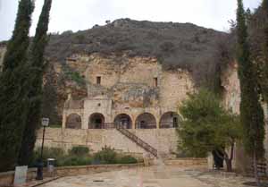 Z czasem dołączyli do niego inni mnisi i uczniowie, pustelnię odwiedzali ludzie, więc w tej celi chował się i pisał księgi oraz traktaty. Jest to najstarsza część monastyru zwana encleistra – pustelnią. Skalny kościół i połączona z nim kaplica obudowane zostały, już w czasach znacznie nam bliższych, nawą z trzema arkadami oraz prostokątną wieżą z płaską kopułą.Wchodzi się do nich po kamiennych schodach jak gdyby przyklejonych, wraz z całą nową częścią tego zespołu, do skalnego zbocza góry. Stanowią one dziś kaplicę Świętego Krzyża którą można zwiedzać. I warto, gdyż ściany i stropy jaskiń pokryte są cennymi freskami i malowidłami. Podobno najstarsze namalował sam Neofitos, później inni mnisi.
