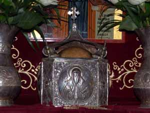Za nimi w apsydzie, niedostępne dla osób świeckich, ale udało mi się je sfotografować przez odsłoniętą z boku zasłonę: ołtarz, drewniany krzyż z ukrzyżowanym Jezusem oraz Marią i Magdaleną po jego bokach. A także ściany i sklepienie pokryte malowidłami o tematyce religijnej, naczynia liturgiczne, żyrandol itp. Najważniejszym dla pątników miejscem w tej świątyni jest jednak boczny ołtarz.Przed ikoną św. Neofity stoi w nim srebrny relikwiarz z czaszką świętego. W drewnianym sarkofagu przechowywane są też jego kości. Klasztor ten posiada również małe muzeum. Za najciekawsze w nim eksponaty uważane są pięknie kute, żelazne korony oraz również zabytkowe, jedwabne szaty cypryjskich biskupów. Jest częstym celem pielgrzymek, zwłaszcza w terminach związanych z życiem jego założyciela i patrona. A zarazem jednym z ponad dwudziestu najważniejszych bizantyjskich monastyrów na wyspie.