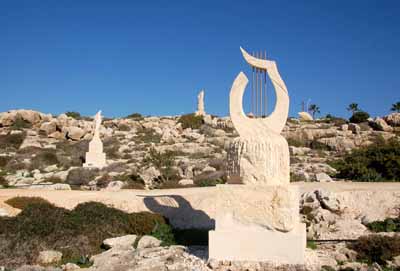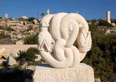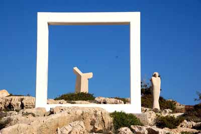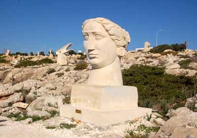 Na skalistych, porośniętych krzewami i drzewami nieużytkach wysokiego, opadającego ku wodzie śródziemnomorskiego brzegu, stoją olśniewając bielą wapienia, rzeźby. Potężna głowa „Afrodyty Cypryjskiej” i, w innym miejscu, postać tej antycznej bogini, od imienia której Cypr nosi drugą nazwę. Tematyki mitologicznej widzę tu więcej. „Europa i Zeus”, „Leda i łabędź”, „Odyseusz”, „Cywilizacja minojska”, „Pegaz”, „Centaur”, „Argonauci”, „Syrena”, „Nike” i wiele innej. Ale także dzieł zatytułowanych: „Grek Zorba”, „Wygnańcy”, „Hipopotamy”, „Miłość”, „Yin i Yang”, „Brama”, „Żaglowiec w świetle księżyca”, czy „Tryptyk organiczny”.