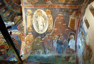 Z wnętrza górującej nad środkiem cerkiewki kopuły groźnie patrzy na ludzi znajdujących się na dole Chrystus Pankrator – Władca Świata. Zaś strop, ściany, łuki drzwi i wszystkie wolne miejsca pokrywają freski. Ale jakie! Jest to przegląd stylów ortodoksyjnego malarstwa cerkiewnego od XI do XVII wieku.