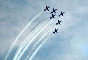 Oczywiście odpowiednio wysoko, aby ludziom na dole nie popękały bębenki w uszach, a fala powietrza nie narobiła szkód. Prezentowana jest też sprawność śmigłowców oraz skoki z nich spadochroniarzy.