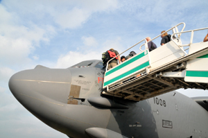 I masę własną prawie 88,5 tony, startową 256 ton, zabiera zaś ponad 180 tys. litrów paliwa oraz jest w stanie przewozić z górą 31 ton broni, rakiet, bomb – także jądrowych, lub kilka ciężkich czołgów. Nam, dziennikarzom, umożliwiono wejście do jego wnętrza i kabiny pilotów. Co okazało się zresztą nie takie proste. Udostępniono nam bowiem właz „od podbrzusza”.