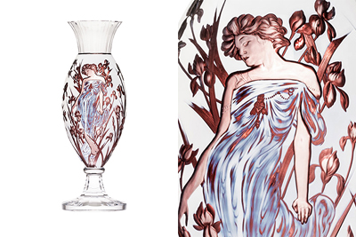 Niekonwencjonalne jasne barwy i ich kombinacje pomogły stworzyć odcienie podobne do oryginalnych rysunków Muchy. Kwiaty nabrały plastycznego charakteru dzięki wielogodzinnemu ręcznemu szlifowaniu i grawerowaniu. Wazy z motywami dzieł Muchy mogą być wspaniałą ozdobą klasycznych i nowoczesnych wnętrz.