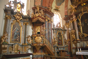 Z wyższą od kopuły dzwonnicą, przebogato zdobionym wnętrzem, a w nim ołtarzem głównym z miedzianą figurą patrona, kaplicami, amboną i organami, obrazami i posągami.