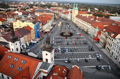 Główny i najpiękniejszy widok z góry mam na Duzy Rynek (Velké náměsti). Tak jak w innych historycznych czeskich miastach, długi plac – ulicę. Zwężający się tak przy jego wschodnim końcu, obok którego położony jest, kilkakrotnie mniejszy, Mały Rynek (Malé náměsti), że wygląda niemal jak trójkątny.