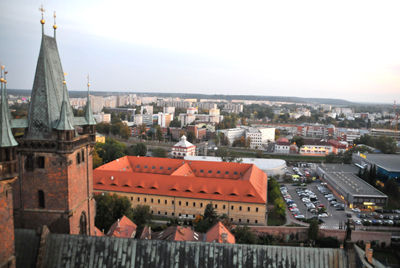 Wróćmy jednak na platformę widokową. Patrząc z niej, tuż obok, po południowej stronie, widzę dwie identyczne gotyckie, ceglane wieże katedry św. Ducha i jej dach. To jedna z najstarszych świątyń miasta, w przeszłości kościół farny, budowany od roku 1307 z fundacji królowej – wdowy (po Wacławie II), Eliški Rejčkej (Elżbiety Ryksy).