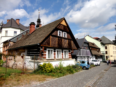 Domy przy Zvĕdavej uličce budowano z potężnych belek konserwowanych krwią wołów, dzięki czemu szybko czerniały. A szczeliny między nimi, zwane listwami, wypełniano masą z iłu, plew i paździerzy oraz malowano na biało. W uliczce tej stoją ponadto dwie XVIII-wieczne figury św. Jana Nepomucena.