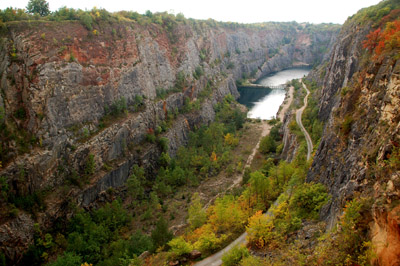 Która podobno jest stale zamknięta, ale z góry widziałem zarówno samochody osobowe, jak i spacerujących turystów. We wschodniej części znajduje się też parking. Z Pragi do „Wielkiej Ameryki” kursują autobusy podmiejskie. Niestety tylko dwie pary w dni powszednie i po jednej w świąteczne. Widoki niemal pionowych, chociaż z 1-2 dawnymi wąskimi tarasami wydobywczymi, ścian kanionu, są fascynujące.