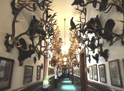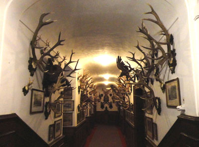 Tylko w jednym korytarzu znajduje się takich „pamiątek” ponad 800 ! A to nawet nie jeden procent zamordowanych przez niego zwierząt. Ponownie używam bardzo mocnego określenia. Ale jak można inaczej, niż mordercą zwierząt, nazwać człowieka, który dla przyjemności, „z myśliwskiej pasji”, pozbawił ich – dziko żyjących – życia, według czeskich źródeł, ponad 300.000 (!!! – to nie błąd). Z czego ponad połowę polecił wypchać, skóry wyprawić, poroża oprawić.