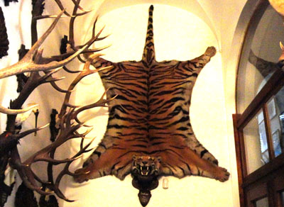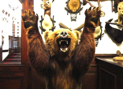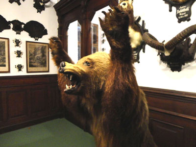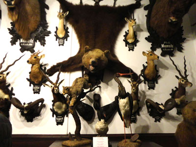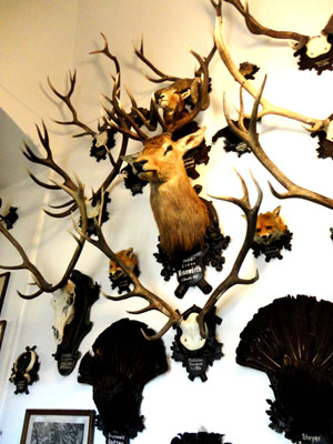 Poroża, wypchane ptaki i łby zwierząt oraz ich skóry, stojące w różnych pozach i zabite w różnym wieku brunatne niedźwiedzie i inne pamiątki z ponad 20 lat polowań na świecie. Także np. skóra tygrysa i innych egzotycznych zwierząt. Ich ilość wręcz poraża.