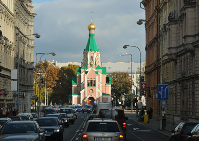 Nawiasem mówiąc świątynia tego ostatniego o kremowo – jaskrawo zielonej kolorystyce, zwieńczona pozłacaną kopułą, nie bardzo pasuje do reszty architektury miasta.