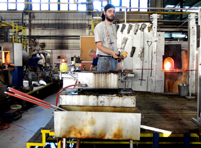 W ogromnej sali z kilkunastoma stanowiskami przy piecach, w których piasek z dodatkami nabierany na końce długich dmuchaw – piszczeli zamienia się w płynną masę szklaną.