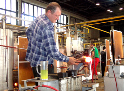 To z niej hutnicy wydmuchują, a następnie formują szklane bańki, z nich zaś różne naczynia. Pomocnicy odbierają je i przenoszą do dalszej obróbki. To, oczywiście, tylko fragment fabryki udostępniany zwiedzającym w celach pokazowych. Chociaż nie jest to produkcja na niby.