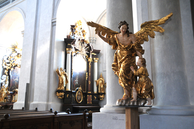 O ozdobienie tej świątyni rzeźbami zatroszczył się najwybitniejszy czeski rzeźbiarz barokowy Mateusz Bernard Braun. Wykuł, częściowo przy pomocy Jerzego Franciszka Pacaka, monumentalne posągi Czterech Ewangelistów.