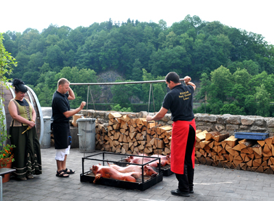 Ale to tylko przygrywka. Kto chce, a chętnych jest większość, może po niej na chwilę wyjść na dziedziniec browaru i obserwować jak przygotowywane jest główne danie wieczoru: pieczone prosiaki. Otwiera się metalowa klapa pieca i z dołu wyciągane są wielkie brytfanny z gotowymi już, przyrumienionymi świnkami roztaczającymi zapach podniecający apetyt.
