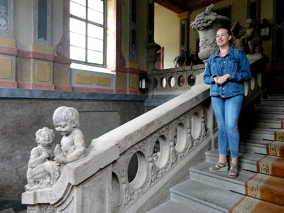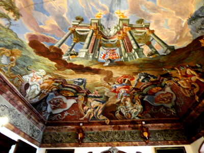 Strop, podobnie jak w części sal i pokoi, pokryty jest barokowymi freskami. Ekspozycja prezentuje życie bogatej szlachty od XVII, do połowu XX wieku. Są w niej apartamenty hrabiowskie: salonik, sypialnia z łożem i pracownia, w której na ścianach wiszą m.in. obrazy przedstawiające Hiszpańską Szkołę Jazdy w Wiedniu.