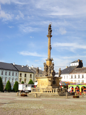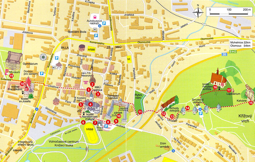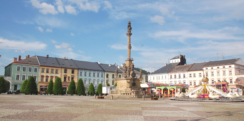 Poczynając od Naměsti (placu, czyli rynku) T.G. Masaryka, stojącego przy nim ratusza, a pośrodku kolumny morowej z lat 1717-1718. I licznych kamieniczek mieszczańskich w rynku i sąsiednich uliczkach. We wspomnianej monografii zabytków miasta opisanych, z ich historią, zdjęciami, detalami, często planami, jest 40 najcenniejszych średniowiecznych i renesansowych.