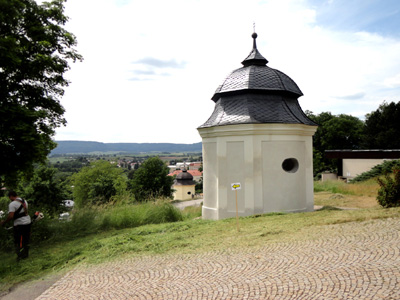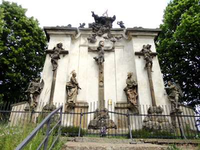 Na wzgórzu Krzyżowy Wierch wznoszącym się na wschód od centrum miasta oraz jego zboczu mieści się cmentarz z gotyckim kościołem, Lapidarium, Droga Krzyżowa i Kalwaria, z którymi związana jest jedna z tutejszych legend. Od strony centrum miasta wchodzi się tam kilkupiętrowymi barokowymi, krytymi schodami z bramą dolną i górną. Kaplice z mansardowymi dachami, rozrzucone na zboczu, są tylko cztery.
