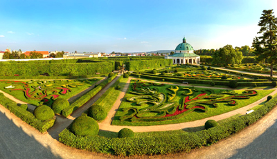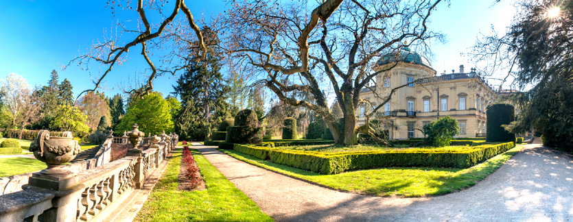 Jeden z najpotężniejszych rodów ówczesnej Europy stworzył na tym miejscu wspaniały ogród francuski i przepiękny park angielski. W ogród i park wkomponowano romantyczne budowle o poetyckich nazwach, np. Świątynia Apolla, Pałacyk Graniczny lub Świątynia Trzech Gracji. Ciekawym objektem jest także minaret o wysokości 60 metrów, z którego rozciąga się piękny widok na okolicę.
