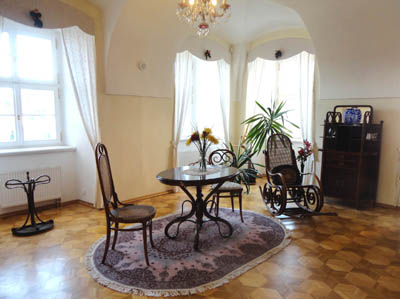 Częściowo w meble i inne ruchomości należące do właścicieli, jak i wypożyczone z Muzeum Sztuki i Przemysłu (Umĕleckoprůmyslové muzeum) w Pradze.
