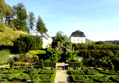 W ogrodach za północną, ozdobną bramą, znajduje się zielony labirynt i niewielki, również otoczony roślinnością, barokowy amfiteatr. A w dawnej oranżerii ciekawe muzeum angielskich kapeluszy damskich. O nim, a także o pierwszym w Czechach Muzeum motorowerów i motocykli w dwupiętrowym, XVIII – wiecznym spichlerzu, wkrótce napiszę osobno.