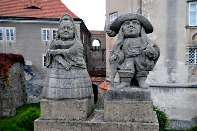 W okolicach fosy i mostu nad nią do bramy głównej, stanęło pięć kamiennych rzeźb karłów – krasnali. Są to dzieła sławnego artysty Matthiasa Bernarda Brauna (1684-1738), autora m.in. znakomitej galerii wielkich, kamiennych, barokowych posągów w Kuksie, wykonanych na zlecenie właściciela tamtejszego pałacu, szpitala i ogrodów, hr. Franza Antona Šporka (Sporcka), o których niedawno pisałem na naszych łamach.
