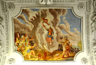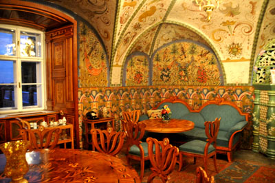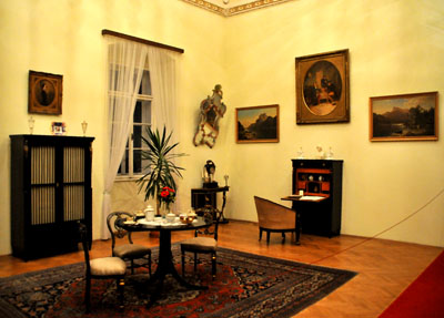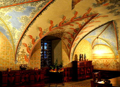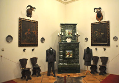 Niesamowita wręcz jest sala z łukowatymi sklepieniami zamalowanymi, podobnie jak jej ściany, niemal co do ostatniego centymetra kwadratowego. Z przysadzisty, ażurowym i wielobarwnym piecem z ceramicznych kafli. I meblami z tej samej epoki. Czy inna, też duża z sufitami pokrytymi barokowymi malowidłami i stiukami.