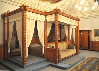 Sypialnia z ogromnym łożem i baldachimem, gabinety robocze i pokoje gościnne, wypełnione dziełami sztuki oraz porożami upolowanych zwierząt zamkowe korytarze. Rzeźby w marmurze i brązie, stare zegary, lichtarze, porcelanowe figurki o tematyce religijnej i świeckiej.