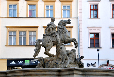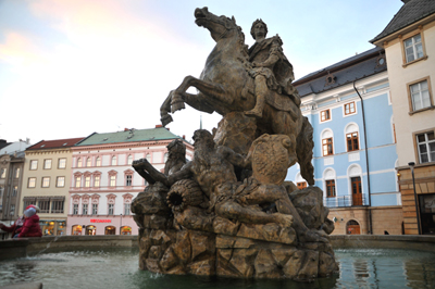 Pod jego nogami leży pies symbolizujący wierność miasta władcy oraz dwie brodate postacie męskie z tarczami. Uosabiają one rzeki: Morawę i Dunaj. Cezar na koniu zwraca głowę w kierunku Wzgórza św. Michała na którym, według legendy, stacjonowały rzymskie legiony. Najsłynniejsza i najcenniejsza jednak na Placu Górnym jest Kolumna Trójcy Przenajświętszej, w 2000 r. wpisana na Listę Dziedzictwa UNESCO.