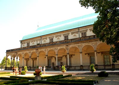 Całość pokrywa miedziany dach o kształcie odwróconego kadłuba statku. A pałacyk ten uważany jest za najpiękniejszą budowlę renesansową na północ od Alp! Trudno wręcz uwierzyć, że w czasach cesarza Józefa II (1741-1790) ta architektoniczna perełka pełniła przez pewien czas funkcję magazynu amunicji. Od połowy XX wieku jest galerią. Królewski Ogród przechodził w swoich blisko pięciowiekowych dziejach oczywiście także przeobrażenia. W XVIII w. dworski ogrodnik František Zinner nadal mu kształt barokowy, a przebudowy dokonali Kiliián Ignac Dienzenhofer i Matyas Braun, który wzbogacił go o rzeźby. Aktualnie główna część ogrodu jest w angielskim stylu XIX wieku. Zachowała się jednak także część renesansowa, Giardinetto, przed Letnim Pałacykiem, z również renesansową tzw. Śpiewającą Fontanną wykonaną przez włoskiego rzeźbiarza Francesca Terza, a odlaną w ludwisarni Tomaša Jaroša. Jej nazwa pochodzi od dźwięków wydawanych przez wodę do miedzianej misy. Są fragmenty – przede wszystkim ornamentalne klomby kwiatowe – barokowe, w rezultacie czego ogród nie stanowi już w całości jednolitego stylu, ale kilka różnych fragmentów. Ma kształt bardzo wydłużonego w dół trapezu, są do niego cztery wejścia. DOMEK